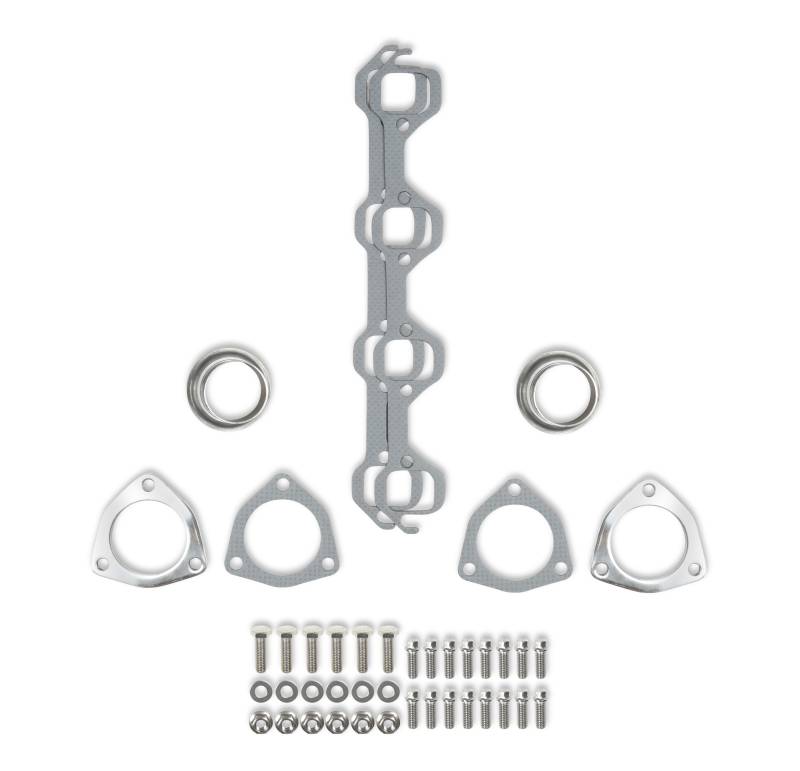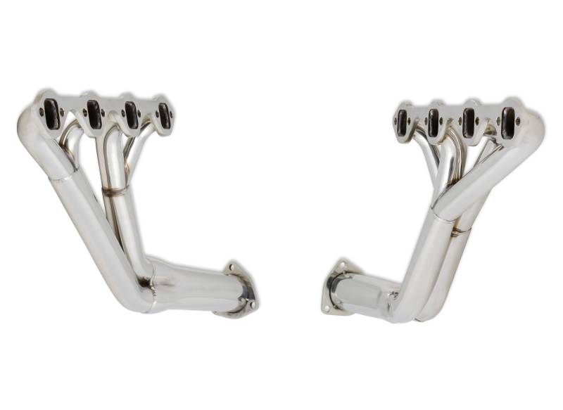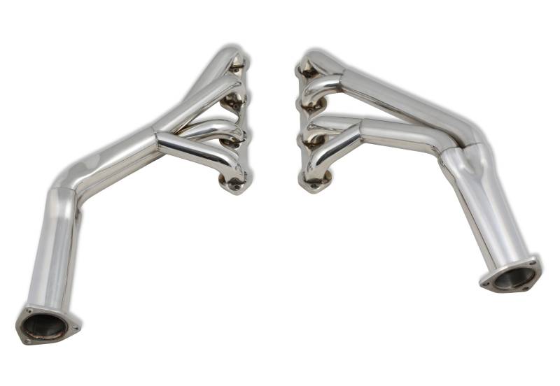 304 stainless steel, 16-gauge tubes are CNC mandrel bent, then carefully welded on our precision engineered welding jig for a perfect fit. These fit both automatic and manual transmissions with the more common 157 Tooth small bell housing, along with extra clearance for starter, mounting flange bolts can easily be accessed and they clear shock towers. Provides full articulation of steering assembly without interference. Power steering cars require drop down bracket. Cars with the larger Bellhousing for 164 Tooth Flywheel will need to dimple header and possibly remove a minimal amount of material from the bellhousing for proper clearance. Shortened collector tubes improve floor pan clearance. All Headers include extra thick, precision ground 5/16" inch flanges to prevent warping., metal composite flange gaskets, 1 1/2" inch primary tubes, 1 3/4" inch secondary tubes and 2 1/2" to 2" inch collector/reducers. Gaskets and all necessary mounting hardware are included.