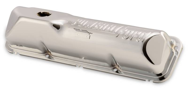 Enhance your engine's looks with these beautiful stamped steel chrome valve covers for the big block "FE" engines featuring "Powered by Ford stamped into each valve cover. The chrome plating aids in the prevention of corrosion to your oil filler tube. Improved oil baffle designed accommodates high lift cams and works with most roller rocker arms. Sold as a set of 2.