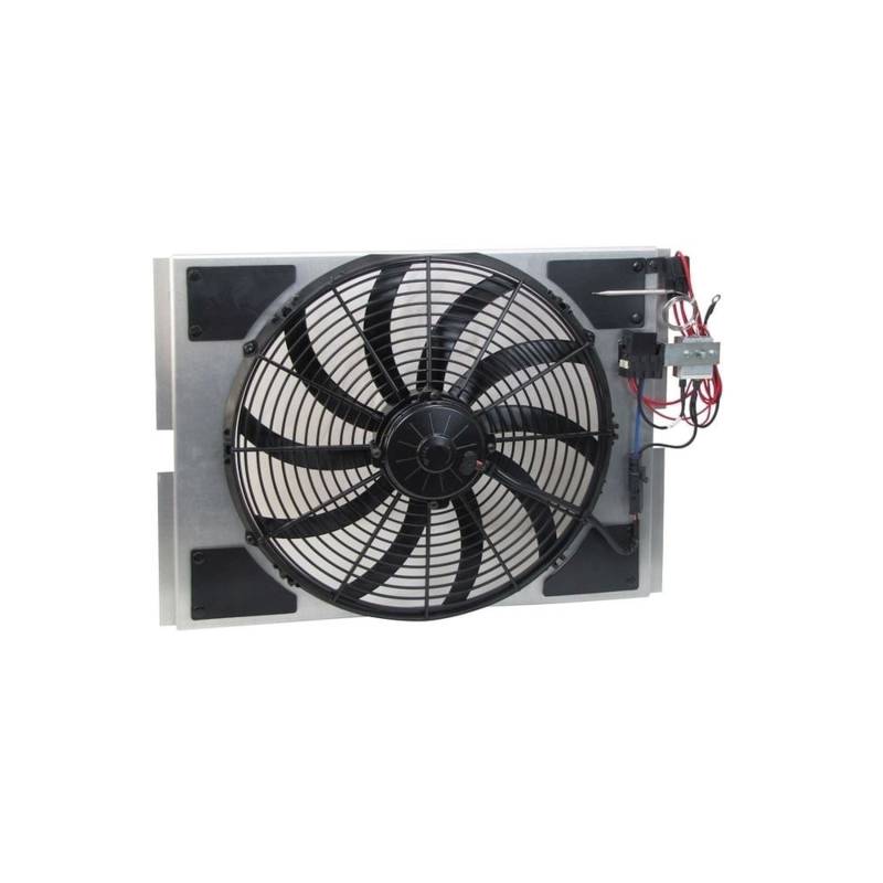 Made for Scott Drake by Old Air Products, this high-performance 2100 CFM 1967-69 Mustang 16" electric fan and shroud kit helps prevent overheating in stop-and-go traffic. Not only does it look great and deliver maximum airflow, but this fan kit also comes fully assembled with the relays, the temperature sending unit, and the wire harness configured for a hassle-free installation. Each fan is individually tested and balanced. This fits stock 20'' mustang radiators 1967-70. 16.25 high x 19.75 wide 16'' spal fan 225w 2100 CFM @ 0 static pressure 17.3 amps depth 3 7/8" shroud flange to back of fan motor. The electric fan kit is also designed specifically for Scott Drake's high-performance 340 series radiators (340-2AL, 340-3, 340-3HF, 340-4).