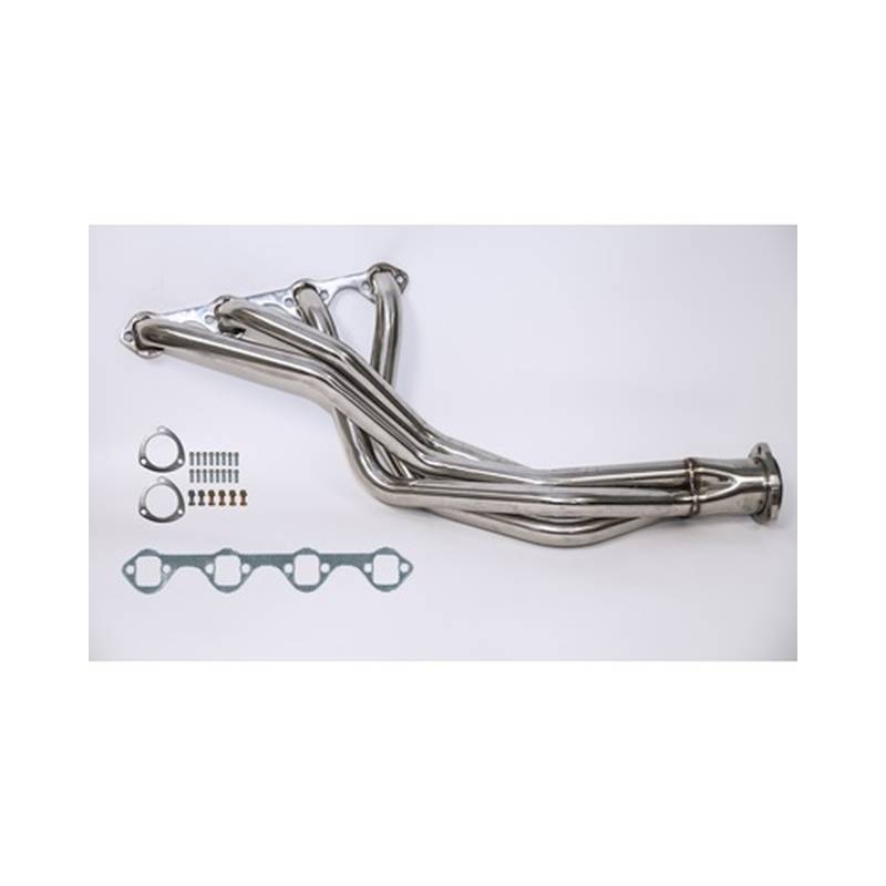 Bolt-on horsepower and torque with these stainless steel long-tube headers by Drake. These headers are designed to fit 66-77 Broncos with 289/302 motors with ample clearance. They are engineered to make strong power and torque throughout the RPM range with smooth mandrel-bent 1-1/2" primaries and 3" collectors. Each header is manufactured with heavy-duty features like extra-thick 3/8" laser cut flanges to guard against warping and heavy-wall 16 ga tubing for maximum durability. This header system includes high quality hardware, premium laminated metal core gaskets, and starter tubes with collector flanges for a professional installation.