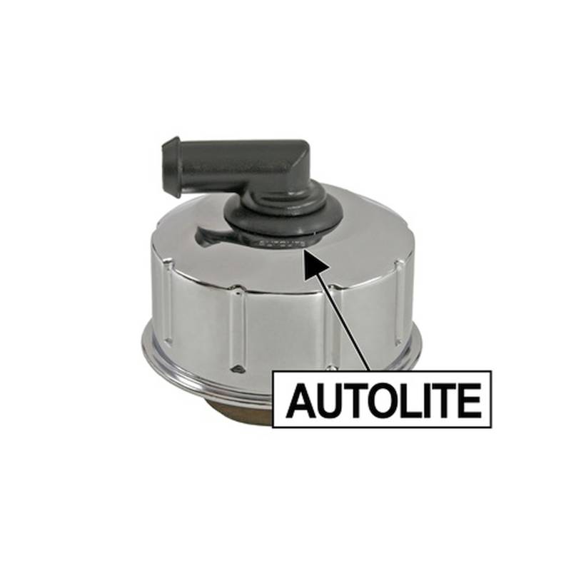 This closed emissions chrome oil cap with an elbow and Autolite Logo is an exact reproduction part for your 1968-1971 Mustang. It features three filters, an Autolite logo, a plastic 90 degree PCV elbow, and is chrome plated. This twist-on style Mustang oil cap is used on closed emission Mustangs and does not require a grommet. Simply twist the Mustang oil cap into the twist-on hole on the valve cover and get back on the road in no time. The PCV elbow is included but not installed for those wanting to re-use their original metal elbow.