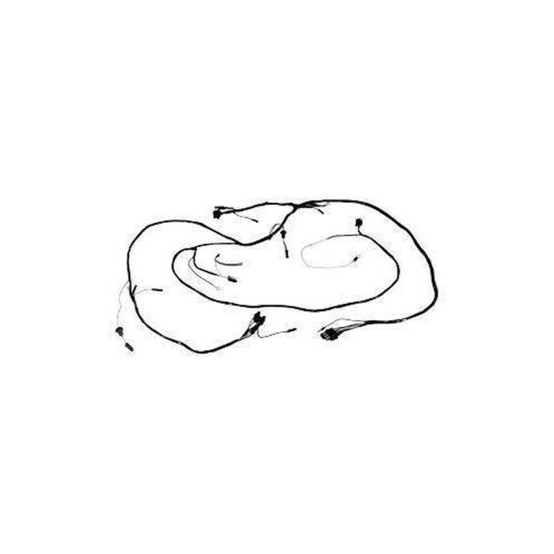 Connects to firewall near master cylinder and runs along driver side inner fender apron and across radiator support. Connects headlamps, parking lamps, horns, voltage regulator, solenoid, and plugs into alternator harness
