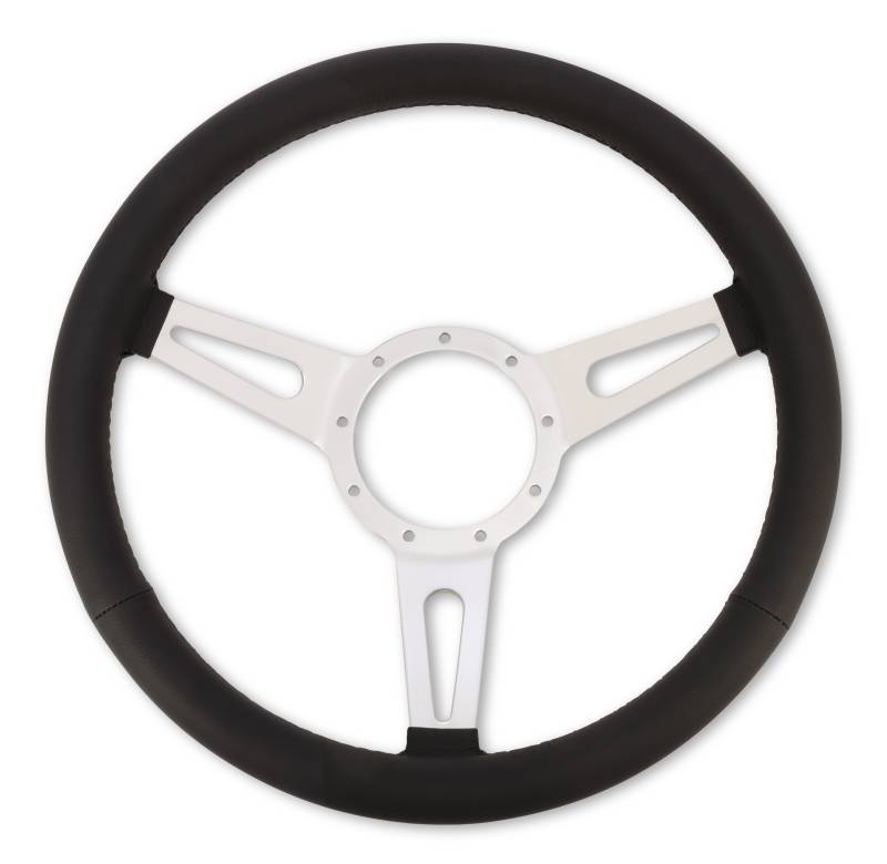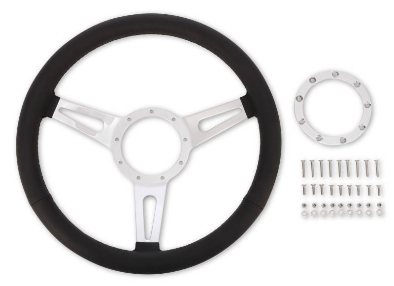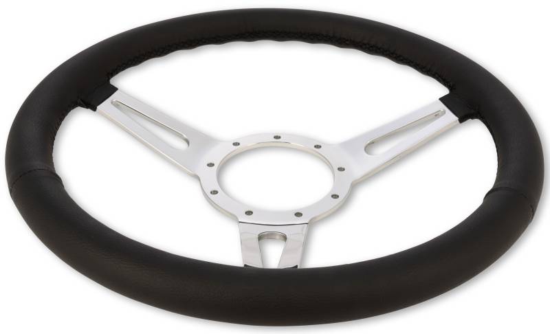 These beautiful Steering Wheels are handcrafted with pride. Featuring polished aluminum spokes. A 15" diameter black leather wheel is hand-stitched onto a fully padded rim for a truly luxurious feeling. Mounting hardware is not included. Column adapter and horn button emblem are sold separately.