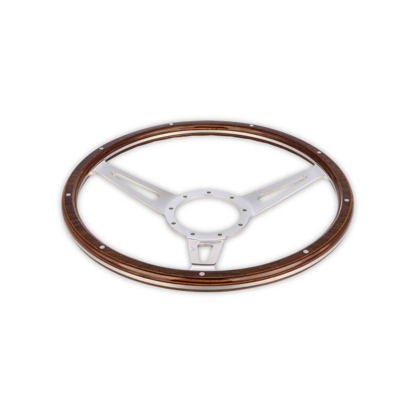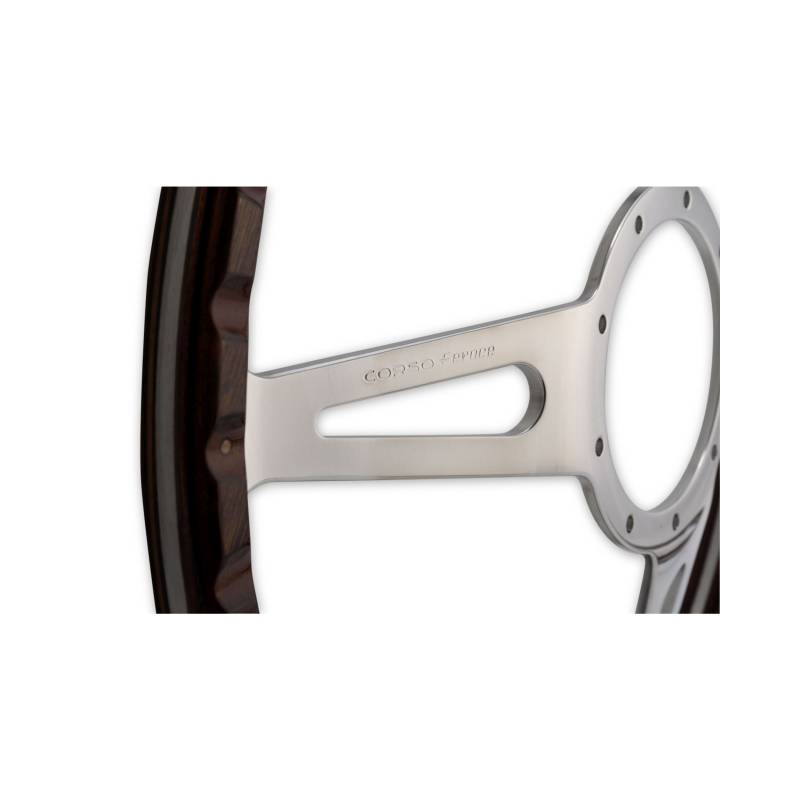 This handcrafted Corso Feroce steering wheel is made from premium quality materials to ensure proper fitment and top-level performance. This 15" diameter, Corso Feroce steering wheel is made with beautiful hand-rubbed marine mahogany and features three mirror-polished aluminum spokes for a luxurious look and feel. With a 9-bolt mounting pattern, this steering wheel is designed specifically for use with Scott Drake's 9-bolt billet telescoping steering wheel adapters. A total of nine stainless steel mounting screws, as well as a mirror, polished retaining to match the steering wheel spoke are included with each steering wheel. The retaining ring is intended to secure the horn button onto the steering. The steering wheel does not come with a steering wheel adapter, horn button, or horn button emblem.