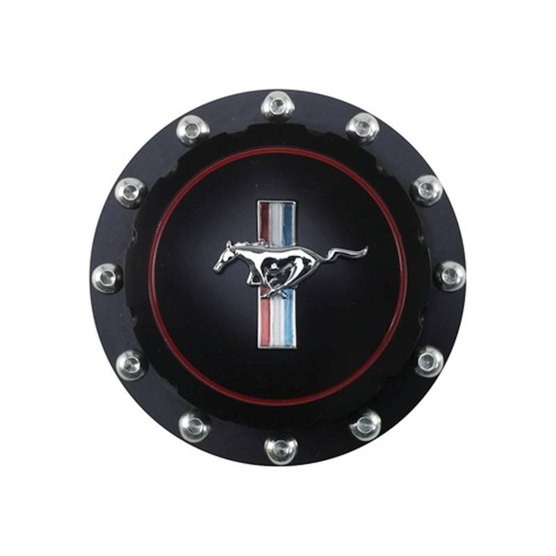 The perfect finishing touch for your "Resto-Mod". Machined from a solid block of billet aluminum. Mounting in the same location as the original gas cap this larger billet black gas cap features simulated Allen head screws, the tri-bar running horse logo in the middle of the gas cap with a bright red trim ring. A proper rubber gasket, original style retainer, and a security cable to deter theft are included.