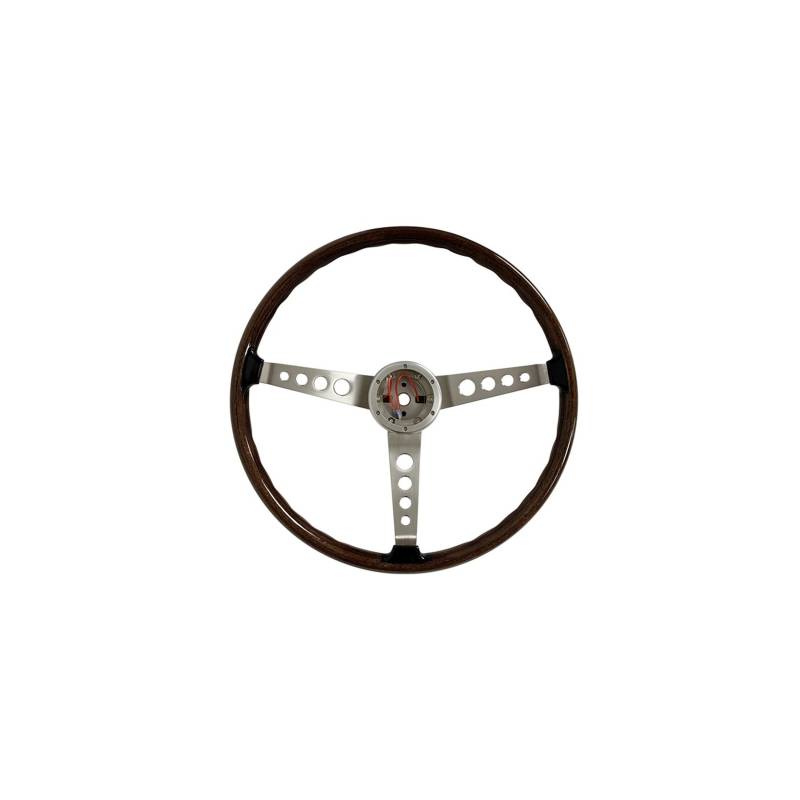 Scott Drake's stunning replica of the wood-rimmed Shelby GT350/500 steering wheel has been wildly popular and has found its way onto many different cars. As the original Shelby steering wheels were made using Mahogany wood, they did not perfectly complement the darker walnut used in 1965-66 Pony interiors, 1968 Deluxe interior, and the 1969-73 Mach 1 and Grande interiors. It features a beautifully finished, solid, genuine wood rim with the proper finger indentations and a distinctive black band around the back surface, just like the originals. The sporty 3-spoke design is made from brushed stainless steel with 4 chamfered holes per spoke and unique black rubber finger guards. The main hub is CNC-machined aluminum with a satin finish. Each wheel is equipped with an integrated 65-73 mounting hub. Concours correct 1967-68 GT350 and GT500 horn button assemblies are available separately, as well as 1965-66 Shelby, Mustang, and Mach 1 horn buttons.