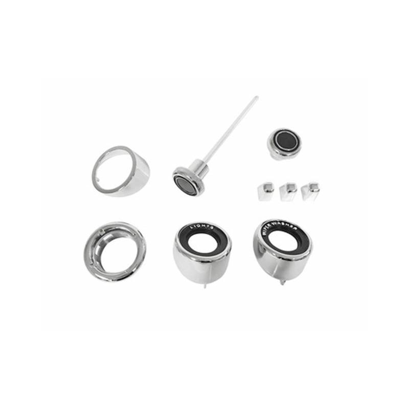Our 9-Piece Dash Bezel and Knob kits feature show-quality chrome in an easy to order kit that includes: wiper knob and wiper bezel, ignition bezel and ignition spacer, headlamp switch knob, headlamp bezel, and heater knobs. Ignition bezel installation tool is available (P/N: T-109-CL) for a hassle-free installation that will not damage your chrome. This kit will work with both A/C and Non-A/C Mustangs.
