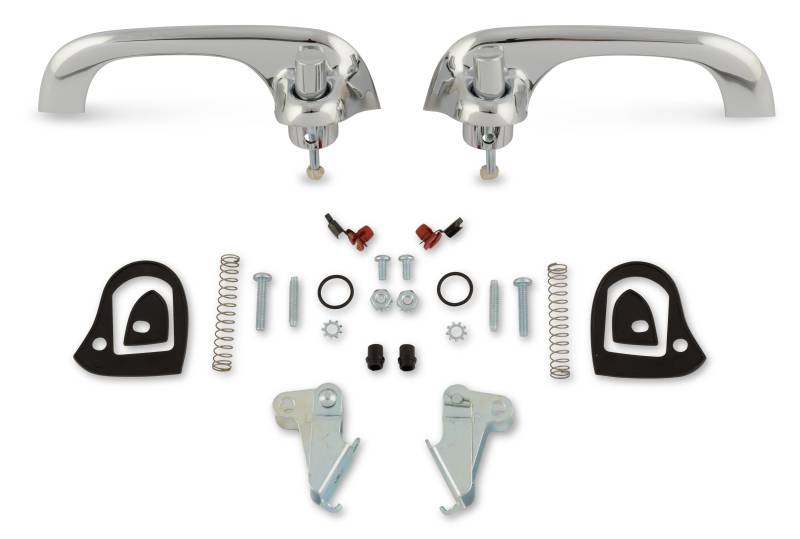 Everything is included in this show-quality chrome exterior door handle kit that you need for an easy and hassle-free installation of both the passenger and driver sides. The kit contains pivot mechanisms, door handles, buttons, gaskets, hardware, and rod clips. These show-quality parts are chrome-plated high-quality reproductions of the originals and direct fit replacements installing in the factory locations.