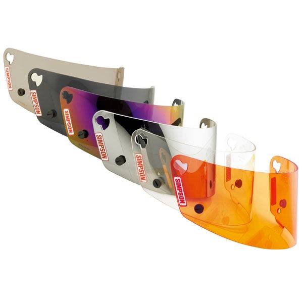 Simpson helmet shields are offered in clear as well as stylish and functional tints. When ordering a shield for your racing or motorcycle helmet, keep these considerations in mind:\nClear shields are generally used for night racing or very low light conditions\nAmber shields provide a minimal amount of tinting that's ideally suited to overcast weather\nYellow shields are often used in dawn or dusk driving, as they tend to accentuate track features\nTinted shields can help to eliminate glare during daytime driving\nSome people find tha mirrored shields block even more sunlight than tinted shields and Iridium shields provide the most protection from both sunlight and glare.