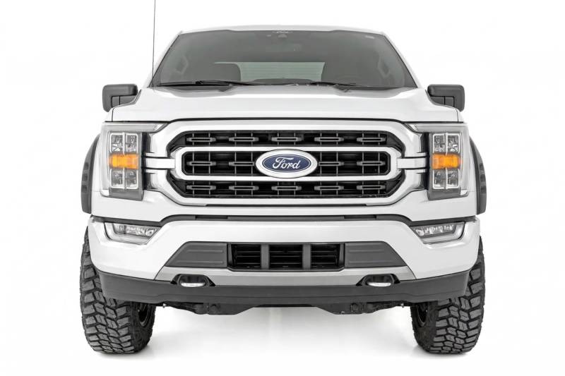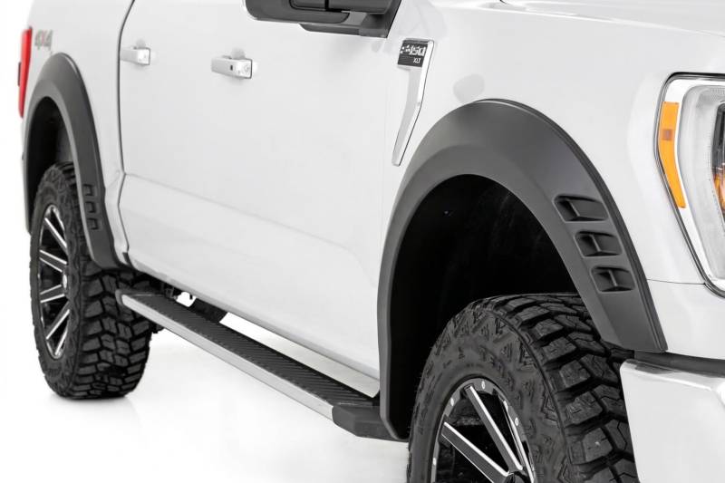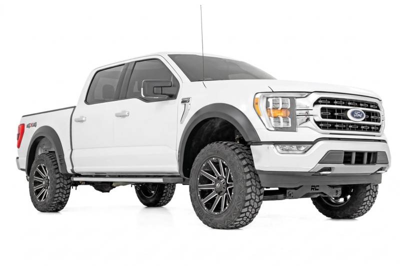 Bold Style with Real Protection: Rough Country's SF1 Fender Flares give your Ford F-150 the tough, finished look your build deserves. With a clean, one-of-a-kind design that complements your truck's body lines, these flares turn heads while providing practical utility. Designed with 2 inches of additional tire coverage and 5.5 inches of flare height, they offer the perfect clearance for oversized wheels and tires and help protect your truck from rocks, mud, and road debris. Integrated rear "mud catchers" further reduce tire sling along your truck's sides.Paint to Match or Customize Your Look: SF1 Fender Flares are available in a convenient Paint to Code option, allowing you to order them pre-painted to match your truck's factory color for a seamless finish right out of the box. Prefer a custom look? These flares also feature a paint-ready surface, giving you the flexibility to color match or personalize your truck's style.Built for Strength and Long Lasting Performance: Made from durable Tri Blend ABS, these fender flares are engineered for both toughness and flexibility. UV resistant for uncoated installs, they resist fading and discoloration caused by sun exposure, ensuring your truck maintains its aggressive appearance for years to come.Quick and Easy Installation: SF1 Fender Flares are a simple bolt-on upgrade using factory mounting points, so there's no drilling required. Each order includes all necessary hardware and step-by-step instructions for a fast, hassle-free installation. The flares can also be removed at any time if you want to return your truck to stock.Warranty You Can Trust: These fender flares are backed by Rough Country's 3-year limited warranty against manufacturer defects. The optional Paint to Code finish also includes a 1-year limited warranty covering paint adhesion and UV protection for added peace of mind.