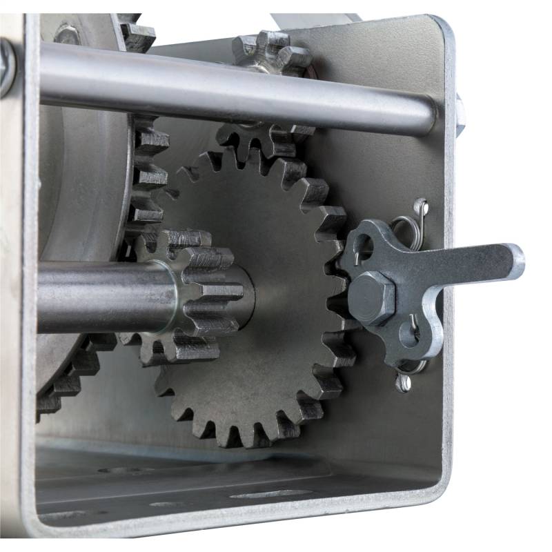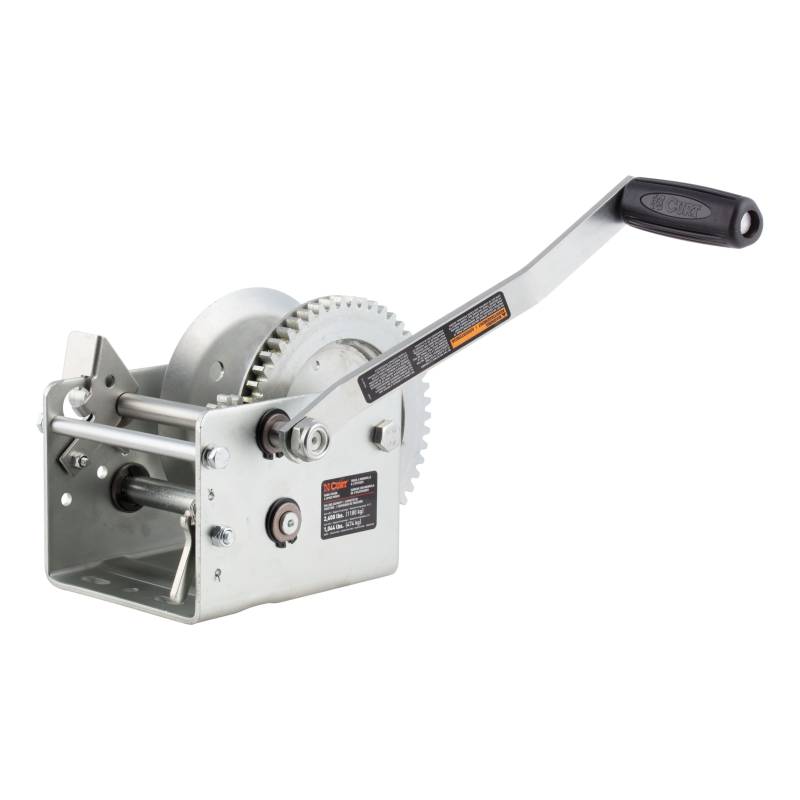 Hand-Crank 2-Speed Winch, 2,600 lbs, 12.7:1 Low Gear Ratio, 10.6" Handle Experience the pinnacle of boating performance with the meticulously engineered CURT 2-speed winch. Crafted from premium cold-forged steel, it boasts solid gears for unmatched reliability in harsh marine conditions. Its universal, slotted screw holes offer effortless mounting, seamlessly replacing most DL and Fulton winches. Whether you're hauling a sizable boat onto your trailer or effortlessly maneuvering heavy loads, this winch is your ultimate companion, handling boats of 20 feet and larger. Engineered for avid boaters, it combines durability with functionality. With a 600-hour salt-spray-tested zinc plating, this boat trailer winch withstands the harshest elements. Oil-impregnated metal bushings ensure smooth operation, while the broached pinion shaft securely engages the gear for seamless functionality. Safety is paramount with its locking lever, ensuring peace of mind during operation. Complete with a comfort grip handle, every detail is designed to enhance your boating adventures. Compatible with a variety of boats and trailers and seamlessly integrating into your boat trailer setup, this winch’s universal design ensures hassle-free installation, empowering both seasoned sailors and weekend enthusiasts to launch with confidence. Universal, slotted screw holes for flexible mounting Compatible replacement for most DL and Fulton winches Ideal for winching +20-foot-long boats onto boat trailer Rated for 2,600 lbs. capacity High-quality, cold-forged steel construction for reliable performance