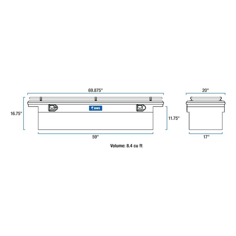 Bright Aluminum 69" Crossover Truck Tool Box with Low Profile & Rail UWS crossover truck tool boxes are the tried-and-true way of keeping your tools organized, on-hand and fully secure no matter where you and your truck roam. Each UWS tool box is built from extra-thick aluminum welded into a single-piece tub. This provides the tool box with reliable strength and helps keep the interior sealed off from the elements. Aluminum construction also makes the box highly resistant to corrosion for long-lasting use. To add even more strength to the crossover truck tool box, the lid features our patented RigidCore foam-filled design. Layered between two sheets of aluminum, this core greatly increases the structural integrity of the lid to prevent bending and warping and to ensure smooth opening and closing. The lid is able to open to a full 90 degrees, providing better access to tools, equipment and other stored items. It also features self-opening struts to make it easy to open the box when your hands are full. This particular truck tool box features a low profile, meaning the lid is built lower than our standard lid. This provides a better view out the rear cab window and additional clearance for other items in the truck bed, if needed. To keep out moisture, dirt and even insects, the lid is also fitted with a MicroSeal gasket that seals off the inside of the tool box from the outside elements. UWS crossover truck tool boxes make it easy to keep your tools and other items organized, featuring built-in screwdriver holders and a three-compartment sliding tool tray. This particular box also features a welded rail on the lid, providing a solid tie-down anchor for securing additional cargo on top. The tool box itself is easy to install and is available in multiple sizes to provide the perfect for your truck and lifestyle. Like all UWS products, each crossover truck tool box is proudly assembled right here in the USA for style and long-lasting dependability. Easy to install with pre-drilled mounting slots and included hardware Patented RigidCore foam-filled lid to maximize strength and prevent binding Built lower on the bed rail for a better view out the rear window Assembled in USA Widespread handles are easy to reach from either side of the truck