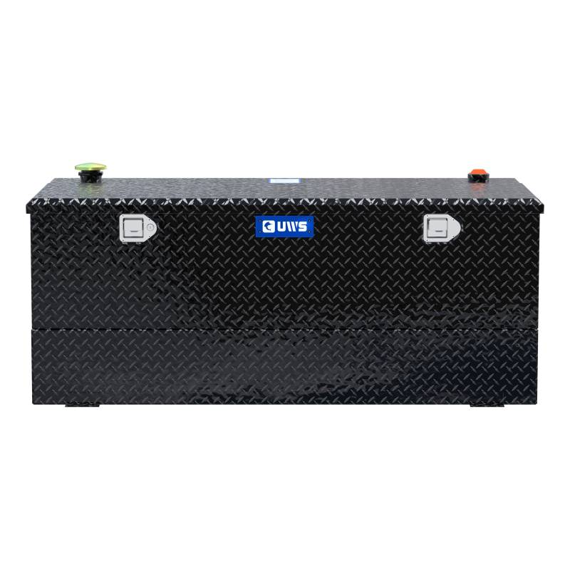 Gloss Black 100-Gallon Combo Aluminum Transfer Tank UWS transfer tanks offer the perfect solution for transporting chemicals, solutions and other non-flammable liquids to your next jobsite. Each tank features corrosion-resistant aluminum construction, a commercial-grade ventilation cap and an optimal fit and capacity to suit your truck and lifestyle. The heavy-duty .125" thick aluminum alloy construction provides the tank with structural strength, while keeping it lightweight and resilient to corrosion. The commercial-grade vented cap allows for proper ventilation of the liquid contents, and the tank is also equipped with commercial-grade mounting flanges for maximum strength in the truck bed. This particular transfer tank is a combination unit, meaning it has a built-in truck tool box to keep your equipment and valuables safe, well-organized and easily accessible whenever needed. The tool box is constructed from extra-thick aluminum for increased structural strength and is welded together into a single piece. The lid features a patented RigidCore foam-filled design, sandwiched between two aluminum plates. This greatly increases lid strength and helps prevent bending and warping. The locking mechanism of this transfer tank tool box provides excellent security for your items, featuring stainless steel, key-operated paddle handles. Stainless steel construction supplies the locks with long-lasting corrosion resistance, and they feature an internal connecting rod that allows the lid to be opened from either side of the truck. UWS transfer tanks are available in multiple sizes to accommodate any job. Like all UWS truck tool boxes, this product is proudly assembled right here in the USA for style and long-lasting dependability. NOTE: This tank is DOT-compliant for transporting Class 3 combustible fuels only, such as diesel. Patented RigidCore foam-filled lid to maximize strength and prevent binding Transfers diesel or other non-flammable liquids to on-site vehicles or equipment Lockable, commercial-grade vented cap with reinforced collar for added security Multiple tank sizes available for a custom fit on each truck application Assembled in USA