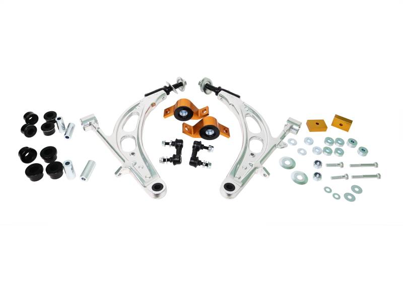 These Whiteline front lower control arms feature high-quality alloy, which offers considerable weight saving over original equipment quality arms. The reduction in weight of the arm, which is partly unsprung weight, brings the similar benefits to a light alloy wheel. In addition Whiteline has engineered significant geometry gains with +0.5deg camber improvements into these arms to optimise wheel alignments settings for street and track performance. Whiteline's rear mounted bushing combines the superior mechanical properties of synthetic elastomer formulation with high quality sealed bearing assembly permitting smooth movement of the arm as the wheel moves up and down. Complemented by a front bushing utilizing an oversized heavy duty crush tube, resulting in dramatic improvements to steering precision, most noticeably reduced 'toe-change' during hard cornering, creating impressive turn-in ability! The more positive location of the arm through the range of suspension movement and gains in alignment geometry ensures the car feels more responsive and engaging at turn-in, mid corner and corner exit.