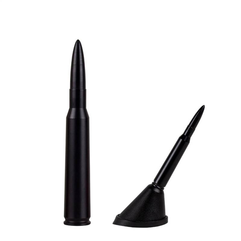 New line of Ammotenna automotive antenna replacement masts! 0.50cal, 0.30cal, 7.62 mm and arrow styles. Each Ammotenna mast is made from 6061 billet aluminum. Multiple adapters are included to Fit most applications including the new Jeep 5/16th thread. Every kit includes a rubber grommet that will help keep moisture out. Each round comes in a wide range of finishes: brass, billet, carbon fiber, gun metal, and anodized black. We also have hydro dipped finishes in some popular designs such as: muddy girls, wildfire, Kryptek, digital camo, the US flag and more. Each antenna CAN easily be mounted on fender and roof applications. Most installations do not require any tools, on some just an adjustable wrench is all that is needed. Optimized for optimum reception of the FM band. With our short antenna, no more worrying about hitting low hanging brush, drive-thru or garage doors .Metras 30FB Billet Aluminum .30 Cal Replica Antenna Mast in flat black finish. Designed for vehicles with removable masts . Replacement antenna .Made with Billet Aluminum . Threaded mounting . Eye catching packaging shaped like a bullet. All kits include adapters for roof or fender mounting. Kits include: * M6-1.0 TO 5/16th * M6-1.0 TO M7-1.0 * M6-1.0 TO M5-0.8 * M6-1.0 TO M4-0 * M6-1.0 TO #10-24 * M6-1.0 TO 1/4-20 * M6-1.0 TO M6-1.0 * M6-1.0 TO 1/4-20 FEMALE ADAPTER * M6-1.0 TO M5-0.8 FEMALE ADAPTER * M6-1.0 TO M7-1.0 FEMALE ADAPTER * RUBBER WASHER. Customize the look of your ride and make a bold statement with Ammotenna replica bullet antennas. Designed for AM/FM radio bands and work with vehicles with removable antenna masts. Multiple adapters included to fit different makes and models. 30. caliber bullet antenna in Flat black finish for stealth look.