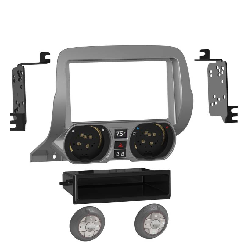Metra 99-3028S Radio Installation Kit for Chevrolet Camaro 2010-2015 Metra 99-3028S Aftermarket Single/Double DIN Radio Installation Kit for Chevrolet Camaro 2010-2015. This stereo installation kit has been engineered to help you install either a 2” tall (Single-DIN) or a 4” tall (Double-DIN) aftermarket radio into the original vehicle dashboard. This dash kit makes radio replacement simple and comes with a pocket that is installed below the 2” radio to fill the extra space in the radio opening, which can be used for storage. The pocket is not needed when installing a 4” tall radio. The dash kit is painted scratch-silver to match the original look and feel of the vehicle’s dashboard. Repurposes the factory climate knobs for a factory look and feel. Includes an Axxess interface, wiring harness, and antenna adapter. Installing an aftermarket radio can upgrade the sound quality and provide additional features the original factory radio couldn’t offer but requires this dash kit to make it fit. ISO DIN radio provision with pocket ISO DDIN radio provision Painted silver to match the factory finish Repurposes the factory climate knobs for a factory look and feel Includes an Axxess interface, wiring harness, and antenna adapter