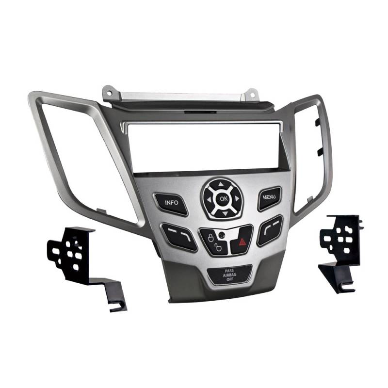 99-5825S Aftermarket Radio Installation Kit in Silver for Ford Fiesta 2011-2019 Metra 99-5825S Aftermarket Radio Installation Kit for Ford Fiesta 2011-2019 models . Installation kit that allows the replacement of the OEM radio with a after market radio. This stereo installation kit has been engineered to help you install either a 2" tall (Single-DIN) aftermarket radio into the original vehicle dashboard. This dash kit makes radio replacement simple. The dash kit is painted scratch-resistant matte silver to match the original look and feel of the vehicle's dashboard. Installing an aftermarket radio can upgrade the sound quality and provide additional features the original factory radio couldn't offer but requires this dash kit to make it fit. ISO DIN radio provision Driver information circuits and buttons Painted silver to match factory finish Kit components: Radio housing, Radio ISO brackets, (6) #8 × 3/8 inch Phillips truss head screws