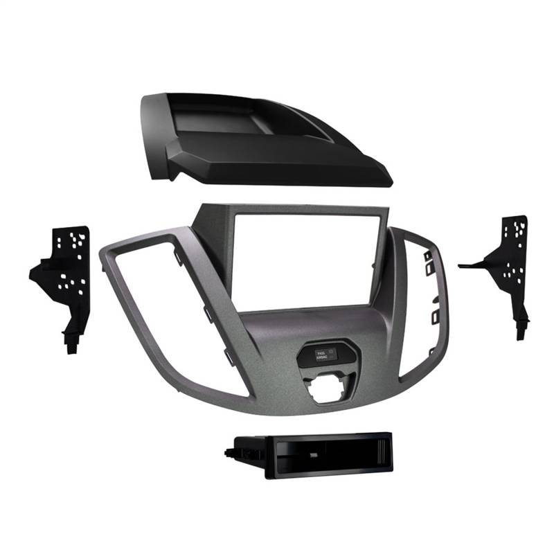 Radio installation kit used when replacing the OEM radio with an aftermarket radio. This kit is contoured to match the OEM dash and painted in a gray finish. Kit will fit a DIN radio with pocket or a double DIN radio in Ford Transit (w/o Nav) 2015-up .