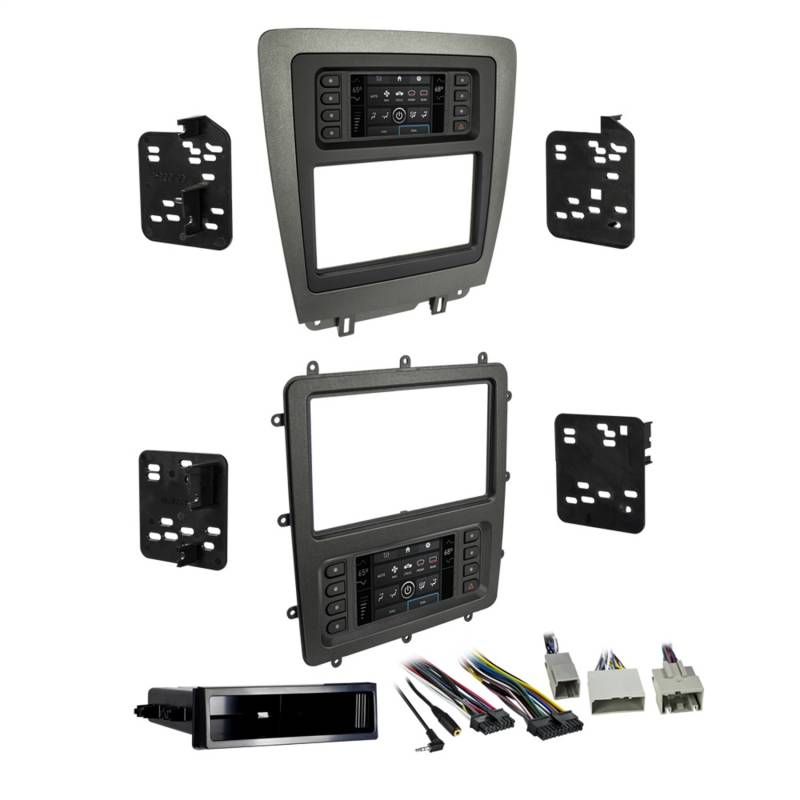 Radio installation kit used when replacing the OEM radio with an aftermarket radio. This kit is contoured to match the OEM dash and is painted in a charcoal finish. Retains the factory climate information and driver customization menu through the touchscreen display. This kit can be installed with the radio up top, or the radio down below. Built in interface in the touchscreen display provides SYNC retention, and the ability to either retain the factory camera or add an aftermarket camera through the touchscreen display. Kit will fit a DIN radio with pocket or a double DIN radio in Ford Mustang 2010-2014 .