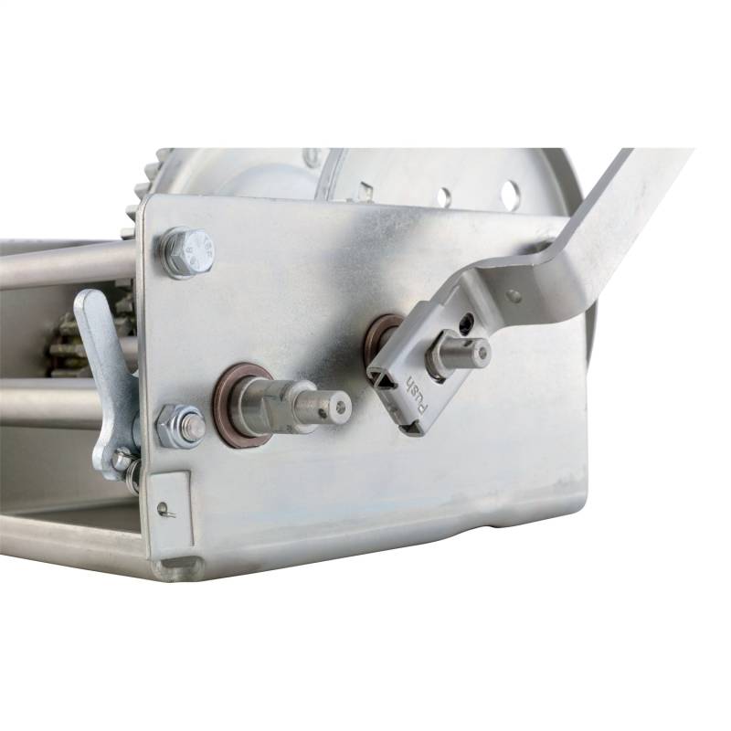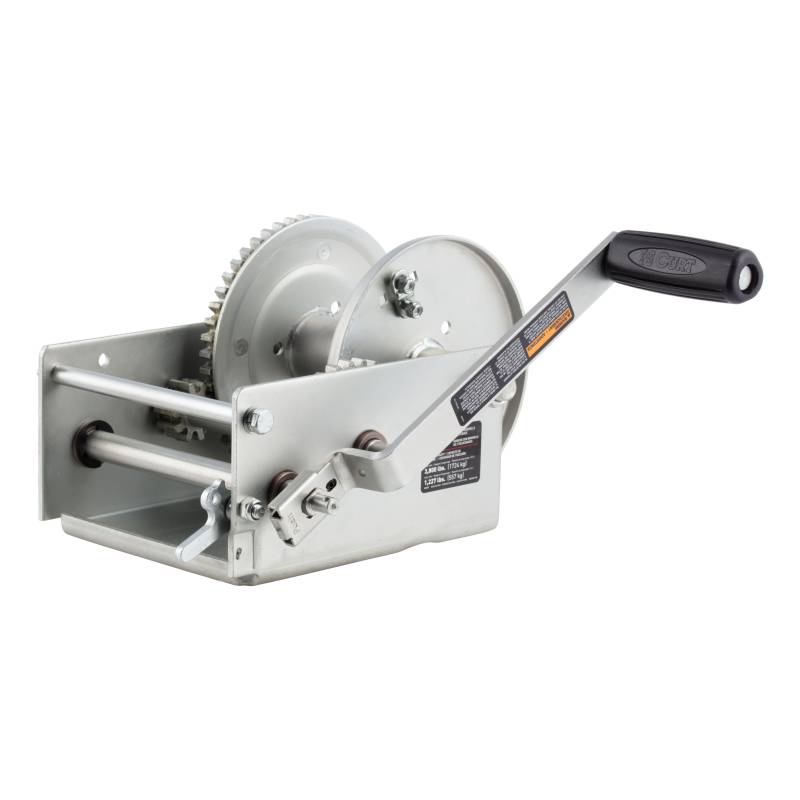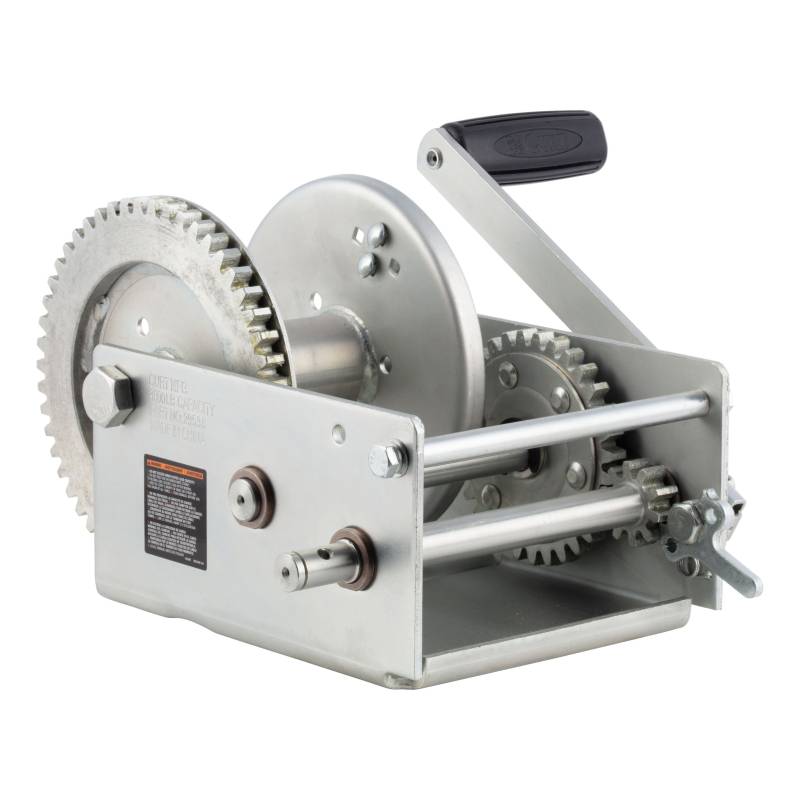 Experience the pinnacle of boating performance with the meticulously engineered CURT 2-speed winch. Crafted from premium cold-forged steel, it boasts solid gears for unmatched reliability in harsh marine conditions. Its universal, slotted screw holes offer effortless mounting, seamlessly replacing most DL and Fulton winches. Whether youre hauling a sizable boat onto your trailer or effortlessly maneuvering heavy loads, this winch is your ultimate companion, handling boats of 20 feet and larger. Engineered for avid boaters, it combines durability with functionality. With a 600-hour salt-spray-tested zinc plating, this boat trailer winch wit'stands the harshest elements. Oil-impregnated, powder-coated metal bushings ensure smooth operation, while the broached pinion shaft securely engages the gear for seamless functionality. Safety is paramount with its locking lever, ensuring peace of mind during operation. Complete with a comfort grip handle, every detail is designed to enhance your boating adventures. Compatible with a variety of boats and trailers and seamlessly integrating into your boat trailer setup, this winch's universal design ensures hassle-free installation, empowering both seasoned sailors and weekend enthusiasts to launch with confidence.