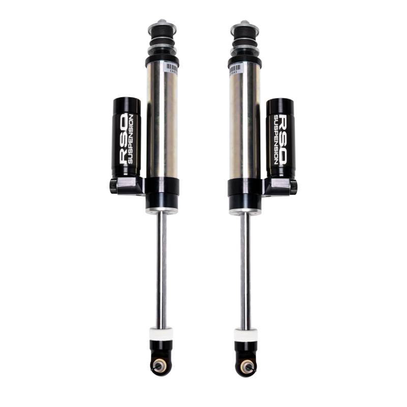 RSO Rear 2.5 Adjustable Remote Reservoir Shocks 0-3in Lift RSO Suspension Adjustable Shocks with Piggyback Reservoir provide improved suspension damping while increasing on and offroad driving comfort. They feature hand adjustable compression levels to dial in and fine tune suspension feel. These 2.5in smooth bore machined alloy bodies give maximum corrosion resistance. The 3/4in steel shafts and heat-treated steel spherical bearings offer strength and dependability. Its external reservoir allows for increased oil and nitrogen capacity giving greater heat dissipation, increasing performance, and eliminating shock fade. The piggyback design keeps the reservoir tight to the shock body away from any moving suspension components with no need for cutting or drilling. Experience for yourself the incredible performance and precise control that RSO Suspension’s new adjustable piggyback shocks deliver. Hand adjustable compression levels (soft or firm) for precise tuning Increased on and offroad comfort while increasing suspension travel and handling 2.5in steel body with polished 3/4in steel shafts and heat-treated spherical bearings offer strength and durability External remote reservoir with PTFE Lined Stainless steel braided tubing and hardened rubber UV coating hose allows for increased oil and nitrogen capacity reducing heat and shock fade. Race-developed high flow piston design Direct replacement for stock and aftermarket lift kits