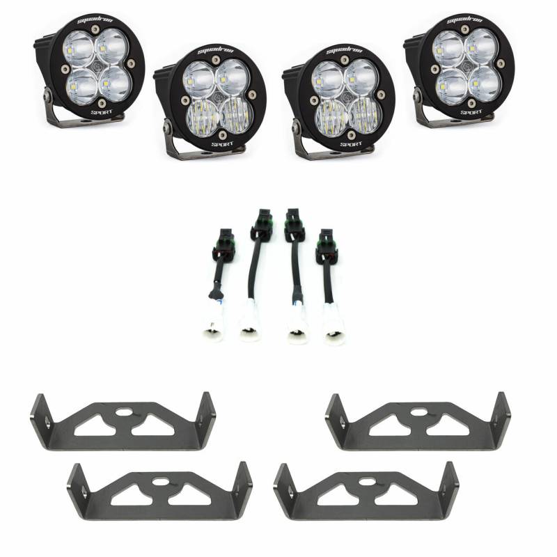 Squadron-R Sport Headlight Kit The days of rushing back to camp before the sun goes down are over thanks to Baja Designs plug and play Yamaha YXZ Headlight Kit. Producing an impressive 7,200 lumens from a total of 4 Squadron-R Sport auxiliary lights, this kit will provide enough light for every type of terrain your Yamaha YXZ will encounter. The kit is completely plug and play, and retains the stock high/low functionality.