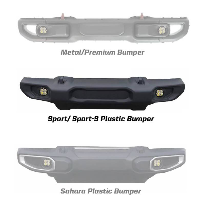 Squadron-R Sport Fog Pocket Light Kit Our JL Sport/Sport-S Fog Pocket replacement kit allows enthusiasts to retain factory fit and finish, while taking advantage of premium aftermarket LED output. This kit features a pair of Squadron-R Sport lights that really pack a punch!? Installing the kit can't be any easier. Our durable brackets have been designed to retain the stock mounting points. The provided wire adapters plug and play right into the OEM connectors, allowing the user to retain use of the factory fog switch, with no need for splicing or soldering. This kit is designed for the following application: JL/Gladiator w/ Sport or Sport-S plastic bumper.