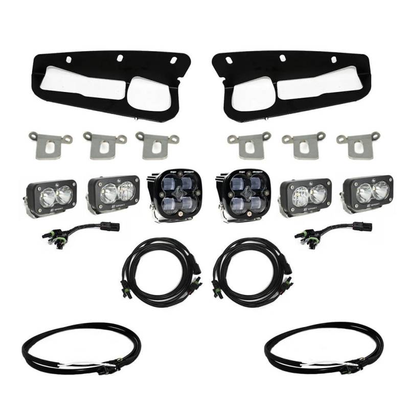 Squadron SAE/Dual S2 Sport Steel Bumper Fog Pocket Light Kit We here at Baja Designs know that you use your Bronco for what it was designed for. That’s why we offer the Squadron(R) SAE/Dual S2 Steel Bumper Fog Pocket Light Kit designed specifically for the factory Steel Bumper. Light up the trail, lead the pack, and differentiate yourself from the pack with a set of S2 Sport in spot, a set of S2 Sport in driving combo, and a set of our next generation Squadron(R) SAE. With all-new aspheric projector optics and with our advanced LED technology provides a performance increase in luminous flux of 56% over our previous generation SAE model. The all-new Squadron(R) SAE delivers 2,420 lumens per light with output reaching up to 15,800 candela at just 29 watts and meets the current SAE J583 fog lamp requirements, making it fully compliant with on-road regulations This is a comprehensive kit and does not require any additional parts for installation. 447761, 447762 Kit Includes: (2) S2 Sport Spot (2) S2 Sport Driving Combo (2) Squadron(R) SAE, Spot in Clear or Amber (2) Left and Right side fog light facia mounts (2) Wire Harnesses (640117) (2) 55? Splitter (613606) (2) Splitter (613607) All Necessary hardwear and parts bags. 447761UP, 447762UP Kit Includes: (2) S2 Sport Spot (2) S2 Sport Driving Combo (2) Squadron(R) SAE, Spot in Clear or Amber (2) Left and Right side fog light facia mounts (2) Upfitter Wire Harnesses (640093) (2) 55? Splitter (613606) (2) Splitter (613607) All Necessary hardwear and parts bags.