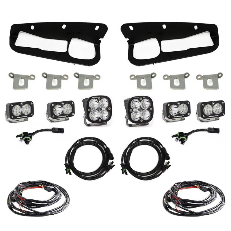Squadron Pro/Dual S2 Sport Steel Bumper Fog Pocket Light Kit We here at Baja Designs know that you use your Bronco for what it was designed for. That's why we offer the ultimate in lighting with the Squadron Pro/Dual S2 Fog Pocket Light Kit designed specifically for the factory Steel Bumper. Light up the trail, lead the pack and differentiate yourself from the pack with a set of S2 Pros in Driving/Combo, a set of S2 Sports in Wide Cornering, and a set of Squadron Pros in Spot. The Squadron Pro Spot beam focuses illumination further down the trail or road and is the go-to choice when you want to annihilate the night and blast away the darkness. The Driving/Combo pattern on the S2 Pro is equipped with both Driving (42 degrees) and spot (8 degrees) optics to provide you with a smooth blend of light for both near-field applications and distance (Lighting Zone 3). The Wide Driving pattern of the S2 Sport offers a 42-degree flattened horizontal beam for the ultimate in comfort lighting. (Lighting Zones 1 & 2). This is a comprehensive kit and does not require any additional parts for installation. 447763 Kit Includes: (2) S2 Pro Driving Combo (2) S2 Sport Wide Cornering (2) Squadron Pro Spot (2) Left and Right side fog light facia mounts (2) Wire Harnesses (640117) (2) 55" Splitter (613606) (2) Splitter (613607) All Necessary hardwear and parts bags. 447763UP Kit Includes: (2) S2 Pro Driving Combo (2) S2 Sport Wide Cornering (2) Squadron Pro Spot (2) Left and Right side fog light facia mounts (2) Upfitter Wire Harnesses (640093) (2) 55" Splitter (613606) (2) Splitter (613607) All Necessary hardwear and parts bags.