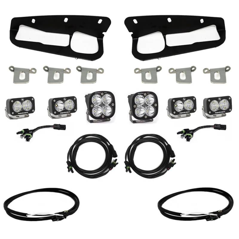 Squadron Pro/Dual S2 Sport Steel Bumper Fog Pocket Light Kit We here at Baja Designs know that you use your Bronco for what it was designed for. That's why we offer the ultimate in lighting with the Squadron Pro/Dual S2 Fog Pocket Light Kit designed specifically for the factory Steel Bumper. Light up the trail, lead the pack and differentiate yourself from the pack with a set of S2 Pros in Driving/Combo, a set of S2 Sports in Wide Cornering, and a set of Squadron Pros in Spot. The Squadron Pro Spot beam focuses illumination further down the trail or road and is the go-to choice when you want to annihilate the night and blast away the darkness. The Driving/Combo pattern on the S2 Pro is equipped with both Driving (42 degrees) and spot (8 degrees) optics to provide you with a smooth blend of light for both near-field applications and distance (Lighting Zone 3). The Wide Driving pattern of the S2 Sport offers a 42-degree flattened horizontal beam for the ultimate in comfort lighting. (Lighting Zones 1 & 2). This is a comprehensive kit and does not require any additional parts for installation. 447763 Kit Includes: (2) S2 Pro Driving Combo (2) S2 Sport Wide Cornering (2) Squadron Pro Spot (2) Left and Right side fog light facia mounts (2) Wire Harnesses (640117) (2) 55" Splitter (613606) (2) Splitter (613607) All Necessary hardwear and parts bags. 447763UP Kit Includes: (2) S2 Pro Driving Combo (2) S2 Sport Wide Cornering (2) Squadron Pro Spot (2) Left and Right side fog light facia mounts (2) Upfitter Wire Harnesses (640093) (2) 55" Splitter (613606) (2) Splitter (613607) All Necessary hardwear and parts bags.
