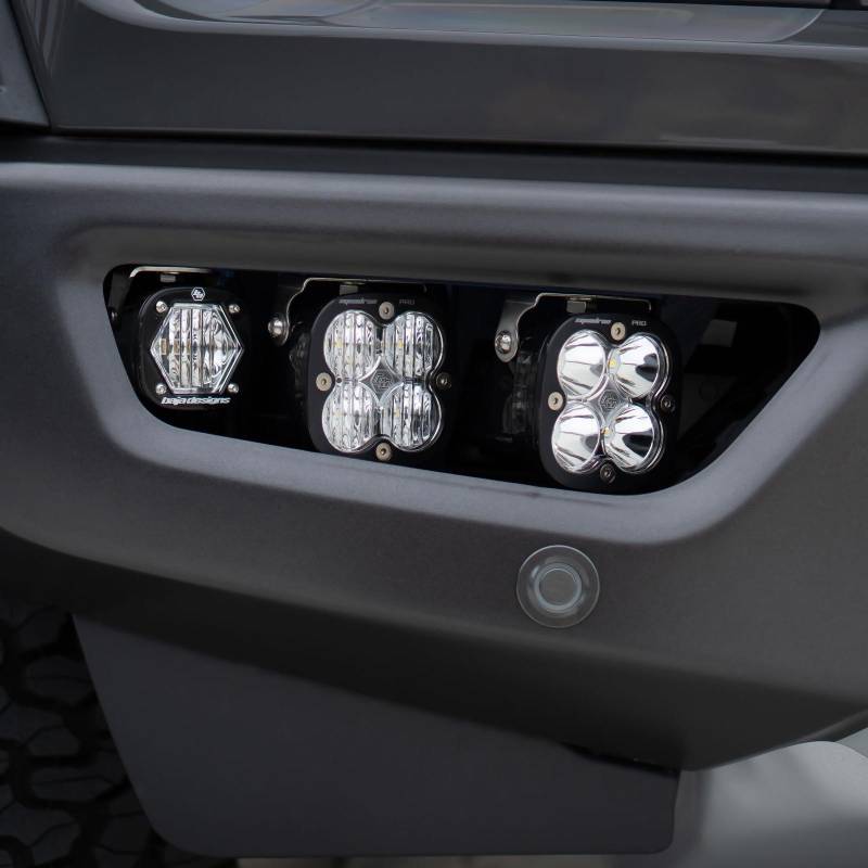 Squadron Pro/S1 Fog Pocket Light Kit Separate your truck from the pack with the Baja Designs Ford Raptor "Pro" Fog Light Kit. This kit utilizes four Squadron Pros (4,600 lumens each), and two S1s (2,375 lumens each). This mounting kit includes two vehicle specific mounting brackets and a wiring harness, allowing you to use your factory switch. US Patent Number 11273751.