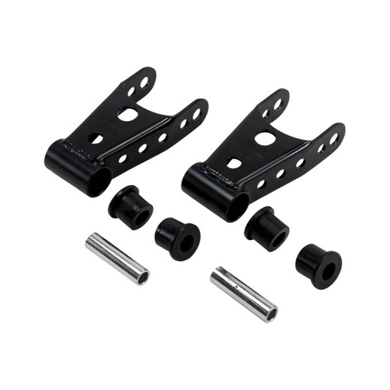 Belltech lowering Shackle kits, a simple, economical way to lower the rear of your truck 1, 2, or 3 inches to help give that leveled appearance. Belltech shackles are constructed from powder coated, heavy gauge die stamped P& O steel featuring OEM quality vulcanized rubber bushings to insure a perfect fit and superior quality for a long, quiet maintenance free life.