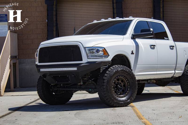 Stealth Fighter Front Bumper Addictive Desert Designs Stealth Fighter front bumper for the Dodge RAM 2500/3500 is a tight fitting radius designed bumper that gives your truck an aggressive stylish look. With a universal light mount system that allows up to a 40" radius LED bar or 10 cube lights, you can mix and match any brand and style light to give your truck the perfect lighting setup for your needs. A steel plate design gives your truck added protection as well as an upgraded look. Reinforced clevis mounts allow the use of 3/4" D-Rings.