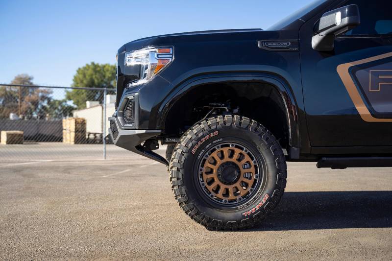 Stealth Fighter Front Bumper The GMC Sierra 1500 has never looked better with the Stealth Fighter front bumper. A radius plate steel design gives your Sierra added front end protection without all the extra bulk. Matching the GMC 1500 body lines, the Stealth Fighter is a tight fitting bumper that compliments the Sierra's look. Our patented universal light mount system allows mounting up to a 40" radius LED or 10 cube lights in the center of the bumper. Mount any combination of brand, size, and style light to give your GMC the added lighting you need. There is also a mount for one cube light behind each side panel. Fully bolt-on means that there is no cutting or welding required to install the Stealth Fighter front bumper. This design keeps the factory fog lights and comes with optional sensor cutouts to retain your factory parking sensors. Reinforced D-Ring mounts and optional winch mount provide your truck with added utility to pull through any tough situation.