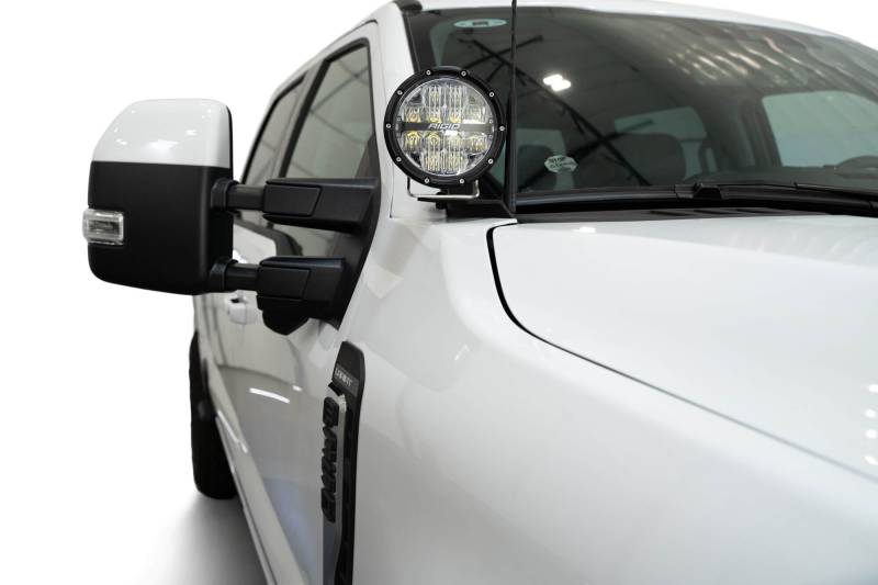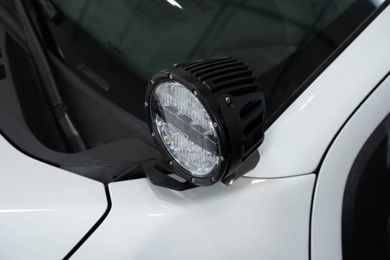 Ditch Light Brackets Our Ditch Light Brackets provide supplemental lighting for worksites and off-road use, accommodating lights ranging from 3" Rigid cube lights to Baja Designs LP6. These brackets are made from 1/8-inch steel with a hammer black powder coat finish for style and protection. They attach to hood hinges near the a-pillar, avoiding obstruction of the sightline, and allow for adjustable light positioning. Made in America.