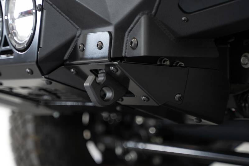 Bomber Front Bumper The Bomber Front Bumper brings a unique and aggressive style to the front end of your Super Duty. At the center of the bumper are 4 flush mounting points for Rigid Industries 360-Series round lights. On each wing is a mounting point for a single 3-inch pod light, such as Rigid D-Series cube lights. These options provide ample lighting while on- or off-road. OEM features like the parking sensors are retained after installing the Bomber. Recovery options include 1-inch thick clevis mounts that take 3/4-inch D-ring tow shackles (7/8-inch pins.) An included 3/16-inch aluminum bumper skid plate provides additional protection and style to the front end of your F-250/350. The Bomber Front Bumper is finished in a Hammer Black powder coat, is fully bolt-on, and like always; Made in America.