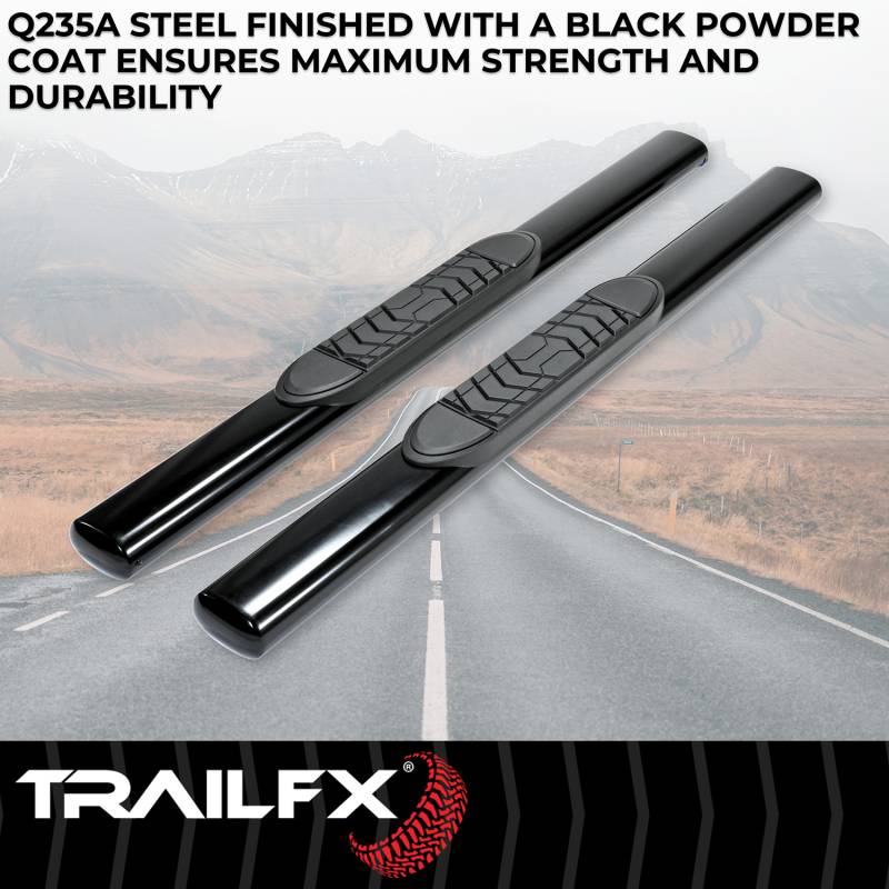 5 Inch Oval Straight Powder Coated Black Steel Rocker Panel Mount When it comes to your truck or SUV, you want quality, style, protection, and durability at a price you can afford. TrailFX offers you an array of products. Whether it is for work or play, TrailFX has something for everyone's needs. Step bars to grille guard Limited 3 Year Warranty Rocker Panel Mount Has A 300 Pounds Capacity Feature All New Super-Wide Molded Step Pads For Sure Footing In All Conditions Step Pads Are Made From UV Resistant Material To Resist Fading And Cracking