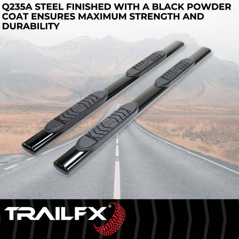 5 Inch Oval Straight Powder Coated Black Steel Rocker Panel Mount When it comes to your truck or SUV, you want quality, style, protection, and durability at a price you can afford. TrailFX offers you an array of products. Whether it is for work or play, TrailFX has something for everyone's needs. Step bars to grille guard Limited 3 Year Warranty Rocker Panel Mount Has A 300 Pounds Capacity Feature All New Super-Wide Molded Step Pads For Sure Footing In All Conditions Step Pads Are Made From UV Resistant Material To Resist Fading And Cracking