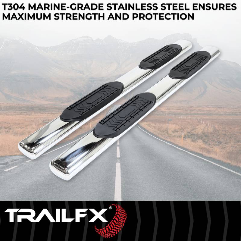 6 Inch Oval Straight Pol Stainless Steel Rocker Panel Mount When it comes to your truck or SUV, you want quality, style, protection, and durability at a price you can afford. TrailFX offers you an array of products. Whether it is for work or play, TrailFX has something for everyone's needs. Step bars to grille guard Limited Lifetime Warranty Rocker Panel Mount Has A 300 Pounds Capacity Highly Polished Oval Tubing For Long Life Step Pads Are Made From High Impact, UV Resistant Polymers Specifically Engineered To Resist Fading And Cracking