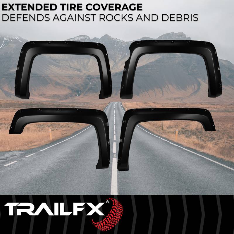 Pocket Style Create that custom, assertive, off-road look you want while protecting your paint from rocks and road debris with TrailFX Pocket Style Fender Flares. These flares are manufactured from durable, impact resistant polypropylene, are 100 Percent UV resistant to prevent cracking and fading, and are available in a smooth paintable finish. TrailFX Flares provide additional tire coverage that spotlights larger wheel and tire packages. Unlike other brands, TrailFX Fender Flares include BOTH polished stainless steel and black steel rivets to choose from with stainless steel jam nuts, allowing you to create a custom appearance that matches the style of your vehicle. Manufactured With Impact Resistant And Durable Polypropylene Plastic With A Smooth, Paintable Black Finish 100 Percent UV-Resistant Protection Prevents Color Fading Extended Tire Coverage Defends Your Truck Or SUV Against Rocks And Debris Pocket-Style Flare Complements Larger Wheel And Tire Packages Includes Both Stainless Steel And Black Steel Rivets To Choose From With Stainless Steel Jam Nuts For Your Own Custom Bolt-On Appearance