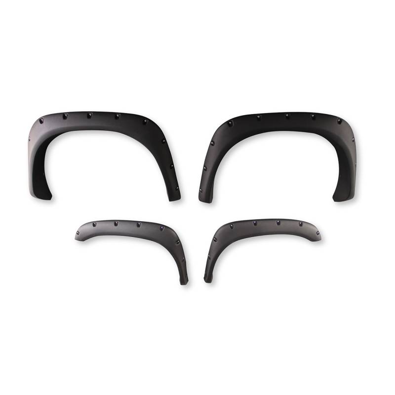 Pocket Style Create that custom, assertive, off-road look you want while protecting your paint from rocks and road debris with TrailFX Pocket Style Fender Flares. These flares are manufactured from durable, impact resistant polypropylene, are 100 Percent UV resistant to prevent cracking and fading, and are available in a smooth paintable finish. TrailFX Flares provide additional tire coverage that spotlights larger wheel and tire packages. Unlike other brands, TrailFX Fender Flares include BOTH polished stainless steel and black steel rivets to choose from with stainless steel jam nuts, allowing you to create a custom appearance that matches the style of your vehicle. Manufactured With Impact Resistant And Durable Polypropylene Plastic With A Smooth, Paintable Black Finish 100 Percent UV-Resistant Protection Prevents Color Fading Extended Tire Coverage Defends Your Truck Or SUV Against Rocks And Debris Pocket-Style Flare Complements Larger Wheel And Tire Packages Includes Both Stainless Steel And Black Steel Rivets To Choose From With Stainless Steel Jam Nuts For Your Own Custom Bolt-On Appearance