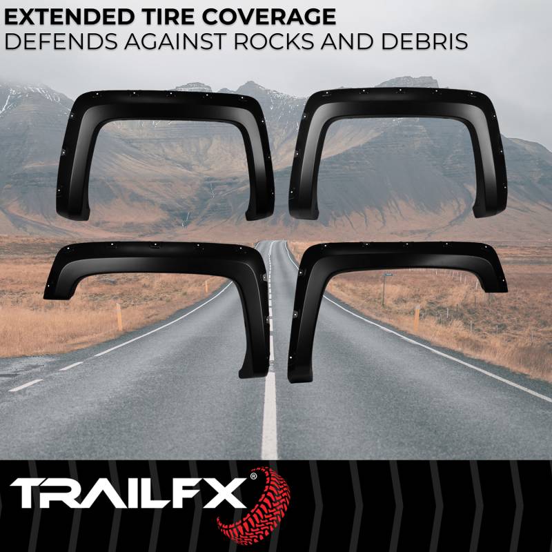Pocket Style Create that custom, assertive, off-road look you want while protecting your paint from rocks and road debris with TrailFX Pocket Style Fender Flares. These flares are manufactured from durable, impact resistant polypropylene, are 100 Percent UV resistant to prevent cracking and fading, and are available in a smooth paintable finish. TrailFX Flares provide additional tire coverage that spotlights larger wheel and tire packages. Unlike other brands, TrailFX Fender Flares include BOTH polished stainless steel and black steel rivets to choose from with stainless steel jam nuts, allowing you to create a custom appearance that matches the style of your vehicle. Manufactured With Impact Resistant And Durable Polypropylene Plastic With A Smooth, Paintable Black Finish 100 Percent UV-Resistant Protection Prevents Color Fading Extended Tire Coverage Defends Your Truck Or SUV Against Rocks And Debris Pocket-Style Flare Complements Larger Wheel And Tire Packages Includes Both Stainless Steel And Black Steel Rivets To Choose From With Stainless Steel Jam Nuts For Your Own Custom Bolt-On Appearance
