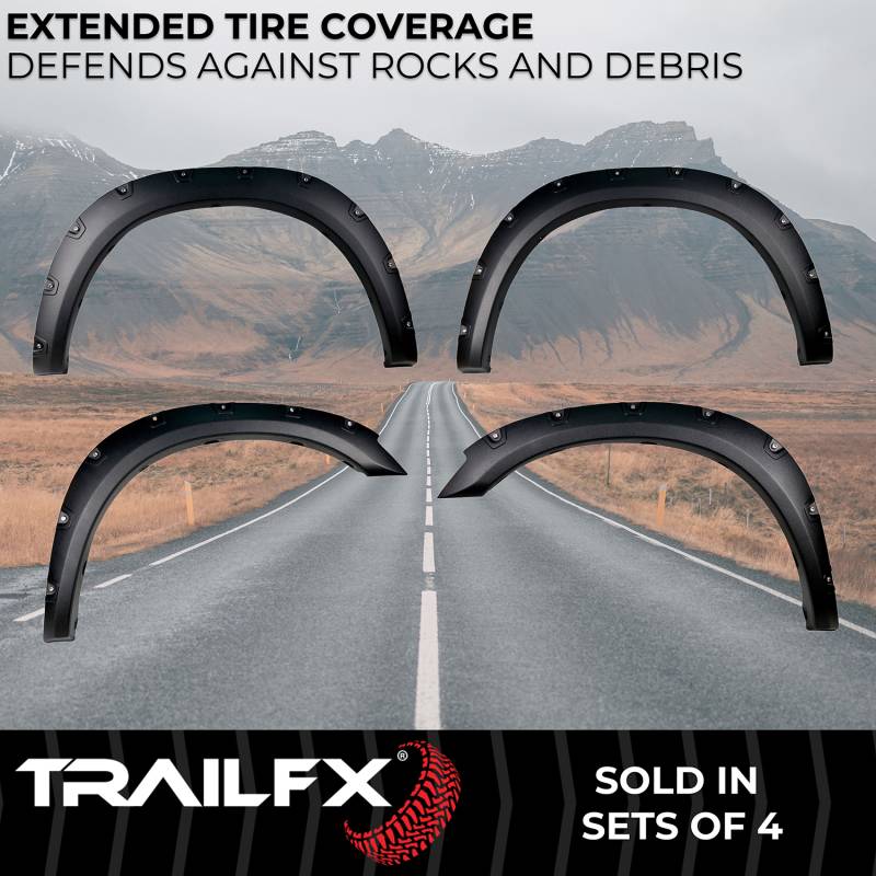 Pocket Style Create that custom, assertive, off-road look you want while protecting your paint from rocks and road debris with TrailFX Pocket Style Fender Flares. These flares are manufactured from durable, impact resistant polypropylene, are 100 Percent UV resistant to prevent cracking and fading, and are available in a textured black finish. TrailFX Flares provide additional tire coverage that spotlights larger wheel and tire packages. Unlike other brands, TrailFX Fender Flares include BOTH polished stainless steel and black steel rivets to choose from with stainless steel jam nuts, allowing you to create a custom appearance that matches the style of your vehicle. Manufactured With Impact Resistant And Durable Polypropylene Plastic With A Textured Black Finish 100 Percent UV-Resistant Protection Prevents Color Fading Extended Tire Coverage Defends Your Truck Or SUV Against Rocks And Debris Pocket-Style Flare Complements Larger Wheel And Tire Packages Includes Both Stainless Steel And Black Steel Rivets To Choose From With Stainless Steel Jam Nuts For Your Own Custom Bolt-On Appearance
