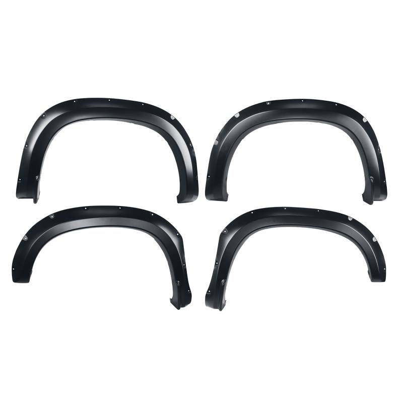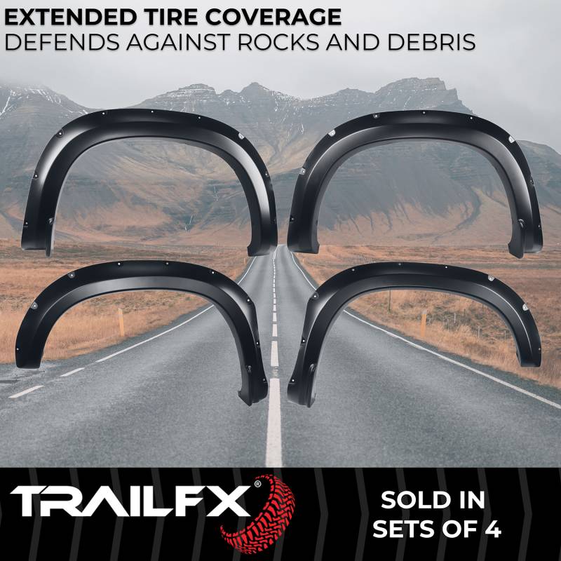 Pocket Style Create that custom, assertive, off-road look you want while protecting your paint from rocks and road debris with TrailFX Pocket Style Fender Flares. These flares are manufactured from durable, impact resistant polypropylene, are 100 Percent UV resistant to prevent cracking and fading, and are available in a smooth paintable finish. TrailFX Flares provide additional tire coverage that spotlights larger wheel and tire packages. Unlike other brands, TrailFX Fender Flares include BOTH polished stainless steel and black steel rivets to choose from with stainless steel jam nuts, allowing you to create a custom appearance that matches the style of your vehicle. Manufactured With Impact Resistant And Durable Polypropylene Plastic With A Smooth, Paintable Black Finish 100 Percent UV-Resistant Protection Prevents Color Fading Extended Tire Coverage Defends Your Truck Or SUV Against Rocks And Debris Pocket-Style Flare Complements Larger Wheel And Tire Packages Includes Both Stainless Steel And Black Steel Rivets To Choose From With Stainless Steel Jam Nuts For Your Own Custom Bolt-On Appearance