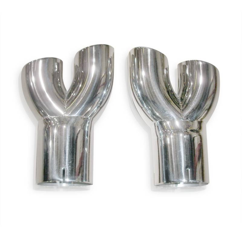 Pair of 2010-15 Camaro style tips with factory ground effects kit, Can be clamped or welded in place. Made from 304 stainless steel for maximum corrosion resistance. Hand mirror polished finish. The quality of our tips is far superior to the less expensive tips on the market. These are TIG welded for strength and durability. These kits come with a lifetime warranty and proudly made in the USA.