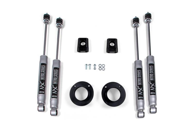 Level the front of your 2014-2026 RAM 2500 4WD truck by installing this 2-inch leveling kit from BDS. Designed to improve stance this kit includes everything necessary to set your truck up right with clearance for up to 35" tires at an affordable price. The lift kit includes steel fabricated coil spacers, extended bump stops, and custom-tuned NX2 Nitro or FOX 2.0 Performance series shocks.
