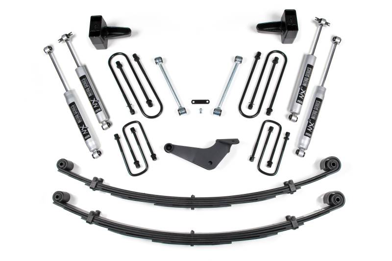 Up front the lift kit includes Glide-Ride leaf springs, forged drop pitman arm and track bar bracket for steering correction, sway bar links, bump stop brackets and precision tuned NX2 or FOX nitrogen charged shocks.