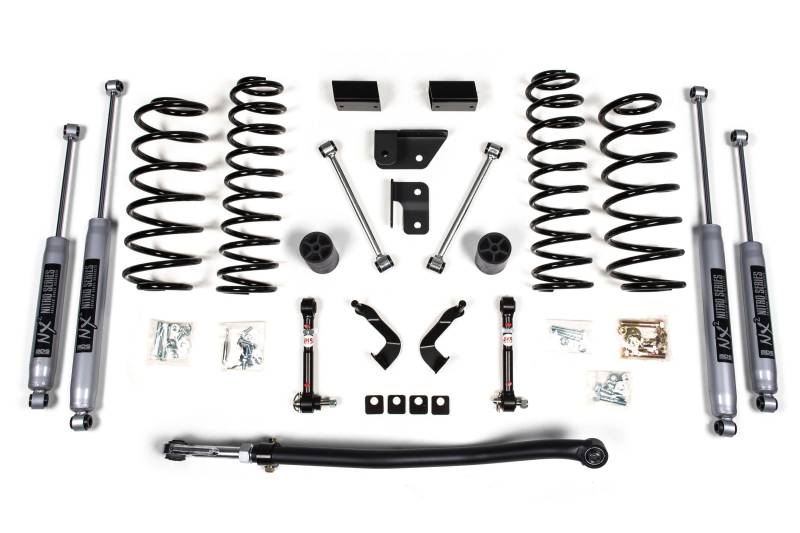 The lift kit includes front and rear BDS Pro-Ride Coil Springs, a heavy duty adjustable front track bar is utilized to re-center the front axle, bump stop extensions, front lower control arm cam locks, JKS quicker disconnects to unlock the front suspension's potential to flex while maintaining quiet on road operation, rear sway bar links, and your choice of specially tuned NX2 nitro series gas shocks or FOX 2.0 IFP performance series gas shocks to offer improved damper performance.