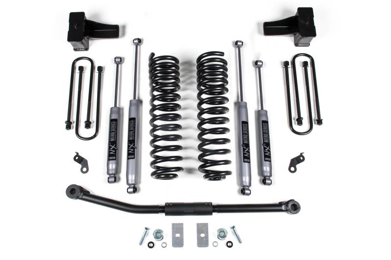 Up front the lift kit includes diesel-specific Pro-Ride coil springs, high strength 1-3/8 inch solid steel track bar for steering correction, brake line brackets and precision tuned nitrogen charged shocks.