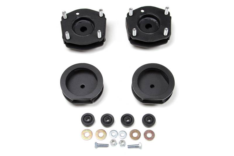 The lift kit includes new upper strut bracket to create pre-load on the strut while putting the strut back in the center of its travel, and rear upper coil spring mounts.